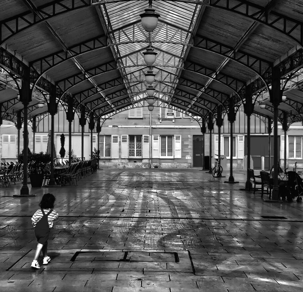 Une course effrénée sous les poutres centenaires de la halle, où la lumière filtre à travers les structures métalliques. Un instant volé, entre innocence et mouvement.