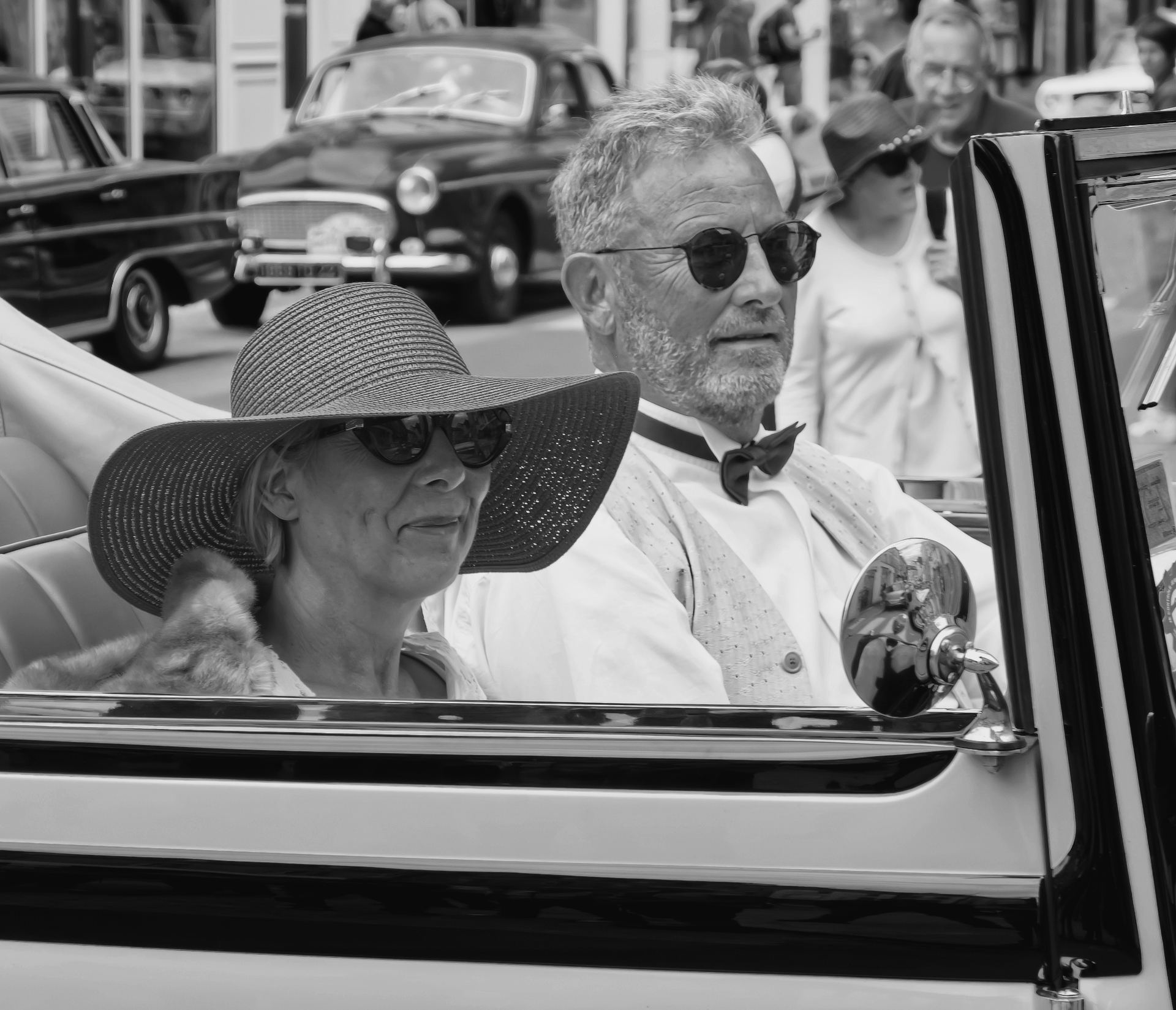 Scène surannée : un couple, sorti d’un film des années 1950, défile dans une voiture d’époque. Lui, nœud papillon rouge et lunettes de soleil ; elle, chapeau de paille écarlate. Le temps semble suspendu, le temps d’un sourire complice.
