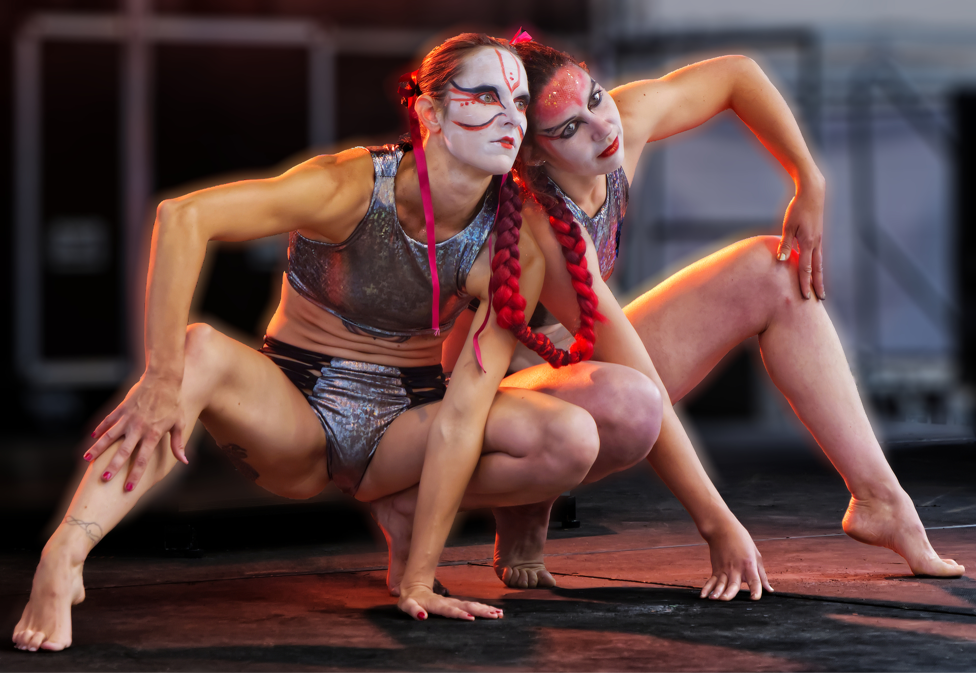 Deux contorsionnistes, corps entrelacés, captivent le public. Leur performance, à la fois puissante et gracile, transforme la scène en un tableau vivant.